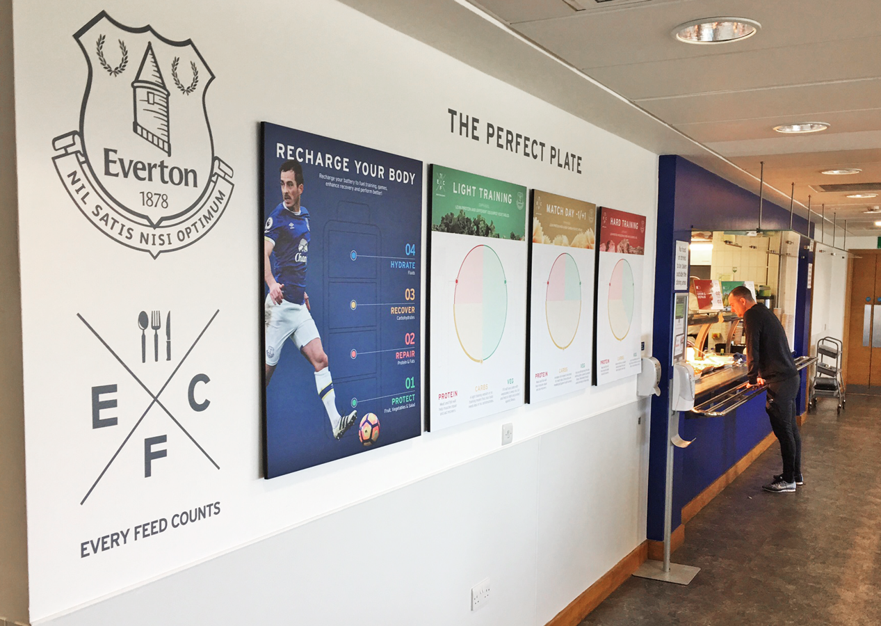 Delivering performance nutrition education using our unique ProSurround System in the dinning rooms and historic club imagery and language in the gym, we created a larger than life wallpaper mural showcasing the clubs history of successes.